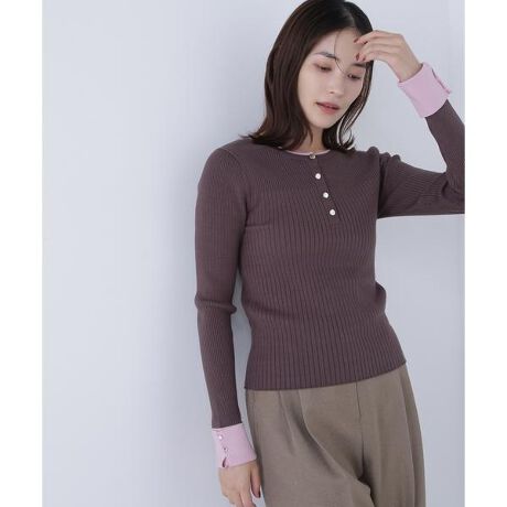 リブピッチを切り替えて立体感とアクセントを加えたバイカラーニット。フロントに付けた飾りのゴールドカラーボタンが上品な華やかさを演出します。袖カフスデザインがさりげないポイントになり、手元を美しく見せてくれます。一枚で着映えるデザインは、カジュアルからキレイめスタイルまで幅広く着回せます。<素材>伸縮性のあるハイゲージリブ編みで、柔らかく体にフィットします。<詳細>仕様・開閉なし裏地・なし透け感・なし / 光沢・なし / 伸縮性・あり生地の厚さ・普通※モデルの着用画像の場合、光の当たり具合により、実際の色味と異なって見えることがございます。色味は、商品単体の画像をご参照ください。