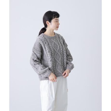やや太めの糸で編み上げられたウール100%のアイテム。ボリュームを感じますが、少し甘く編んでいるので着用するとからだに馴染み、大きくは見えないのがポイント。見た目よりも軽いので気軽に手に取っていただけるおすすめアイテムです。肩の落ち具合が抜けた雰囲気を演出。首元も開きすぎず上品な印象に仕上げました。スカートやパンツはもちろん、ワンピースの上にレイヤードしたスタイリングも素敵ですよ。シリーズで他の商品もご用意しているのでぜひご覧ください。