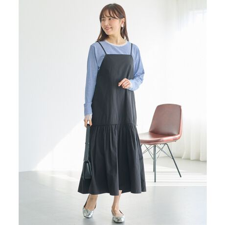 肩紐はフェミニンな印象のリボンコード仕様で、長さ調整も可能です。ボディラインを拾わないシルエットで体型をカバー◎