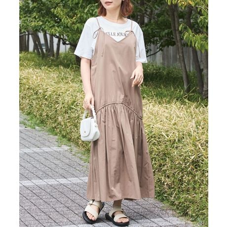 肩紐はフェミニンな印象のリボンコード仕様で、長さ調整も可能です。ボディラインを拾わないシルエットで体型をカバー◎
