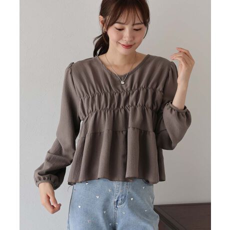 身頃にあしらったシャーリングと裾のティアードフリルが、ふんわりと女性らしい印象に。