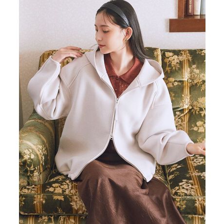 弾力のある優しい着心地が魅力のダンボールニットブルゾン。フーディータイプのカジュアルなデザインで普段使いにも最適な汎用性の高い1着です。ダーツを加えた丸みのある袖やバックヘムがこなれ感たっぷりに演出。裾のドロストコードできゅっと絞りを入れたアレンジも可能です。ジップ開閉で着脱しやすく、着回し力の高いおすすめのアイテムです。