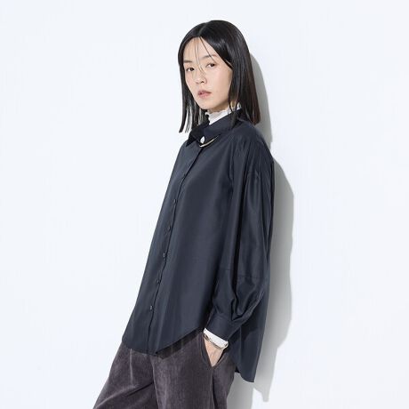 台襟付きのシャツカラーは、Tシャツの上に羽織るのも決まりやすくジレやセーターのインにも合わせやすい便利アイテムです。