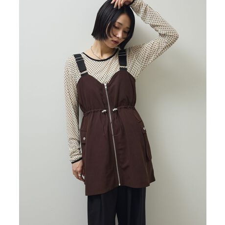 いつものスタイリングにプラスワンして楽しめるキャミソールチュニック。ミリタリーライクなベルトストラップにサイドのベローズポケットがトレンド感あるデザインです。トップはドロストゴムで絞りアレンジも楽しめ、ジップやボタンのメタルパーツもアクセントに。艶感のある生地でカジュアル過ぎず、モードに仕上げてくれるおすすめのアイテムです。透け感[なし]