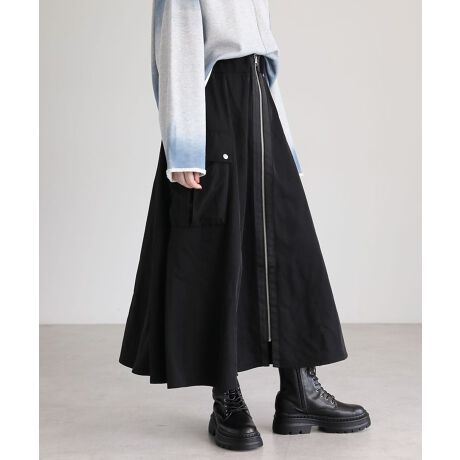 ミリタリーテイストのスタイリッシュなスカート。大きいカーゴポケットやフロントファスナーがカジュアルながら、程よく広がるフレアシルエットや光沢のある素材感が女性らしさをプラスします。やや幅広のウエストゴムで穿き心地良く、楽に着脱出来るのも嬉しいポイント。シンプルなトップスに合わせるだけでこなれたコーディネートが完成するおすすめのアイテムです。透け感[なし]
