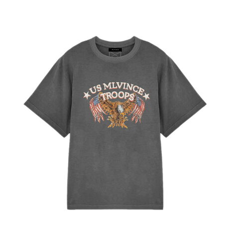 星条旗を纏ったイーグルと「US MLVINCE TROOPS」のレタリングをヴィンテージ調に落とし込み、存在感のある一枚に仕上げました。