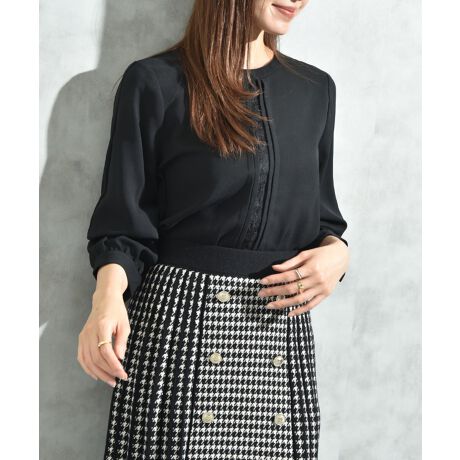 ナチュラルな素材感で肌触りの良いポリエステル生地を使用し、上品なレースデザインが目を惹くブラウス。ネックレスなどアクセサリーが無くても顔回りを華やかに演出してくれます。身体から程よく離れるサイジングで体型カバーにもなり、シワになりにくく透け感の少ない素材なのもおススメなポイント。