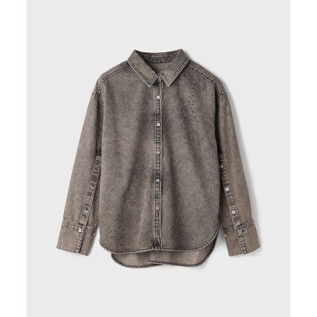 [型番:0125441110]ビジューで魅せる、ワンランク上の華やかなデニムシャツ。7.5オンスのブラックデニム地に煌めくビジューを前身頃に大胆に入れた、カジュアルとフェミニンのバランスが美しく調和した一枚。ゆったりとしたシルエットながらラフ過ぎず、大人のカジュアルスタイルに品よく溶け込むデザインです。スリットスリーブの釦をあけるとケープ風にも着ていただける、モードなデザインに仕上げました。コーディネートの主役にぴったりなアイテムです。