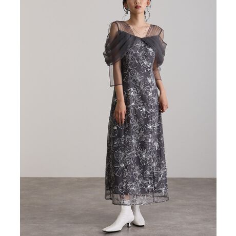 肩周りやお袖にかけて、美しい透け感のあるチュール素材を使用。
