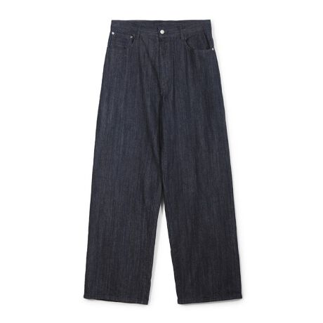 腰から裾まで直線的に落ちるワイドフィットのシルエットは、ボリュームのあるラインがデニム特有の質感と相まって存在感を放ちます。