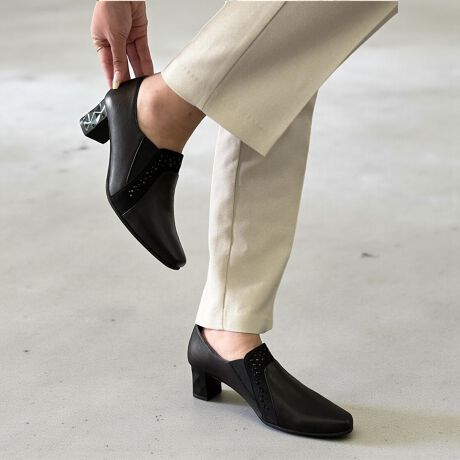 甲部分にあしらわれた控えめな装飾とサイドのゴム仕様が、デザインのアクセントになるとともに、スムーズな着脱を可能にします。