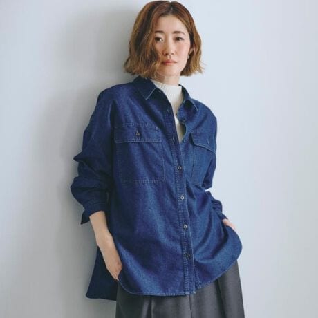 デニムシャツを探していたところ、ショート丈は珍しいと思い購入しました。ロングスカートやワイドパンツと相性が良いです。生地はやわらかくゴワつく感じは無いです。冬はセーターの中に着用して襟を出して着てみたいと思います。