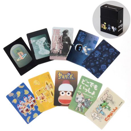 見る角度によって絵柄がチェンジする、レンチキュラー印刷を使用したカードです。1つの商品で複数の絵柄の転換を楽しめます。「どこでもいっしょ」「サルゲッチュ」シリーズ、初代プレイステーションのデザインなど、全10種類のレンチキュラーカードがセットになっています。