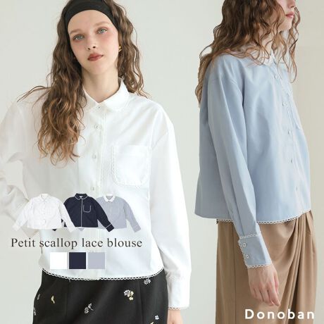 衿・前立て・ポケット・袖口を縁取る繊細なスカラップレースがアクセントとなり、