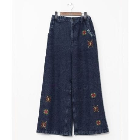 [型番:IDS-5316-2025]ヴィンテージ風にウォッシュ加工された、ベルボトム風デニムパンツ。トレンド感のある長めの着丈で、脚長効果も期待できます。ウエスト背面にはゴム入りなので、スッキリ着こなせるのも嬉しいポイント。シルクロードの交差点であるウズベキスタンをテーマに、ラグに使われるステッチや、ウズベク語での挨拶やの文字の刺しゅうを散りばめました。Salom:こんにちは Rahmat:ありがとう