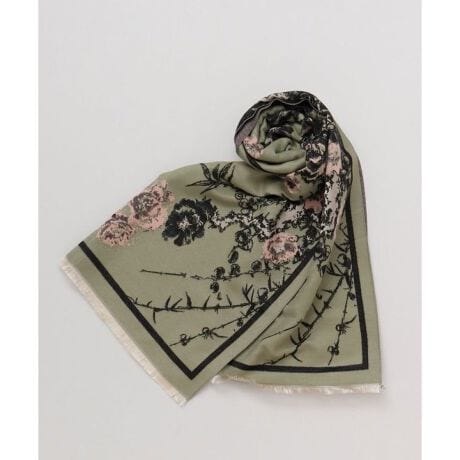 [型番:7CJP5308-2025]モダンな雰囲気の花々が連なる様子を描いたストール。ビンテージ風の色合いは、和装と合わせても上品な雰囲気を楽しめます。幅が広めなので、肩からかけてショールとしても使用できます。