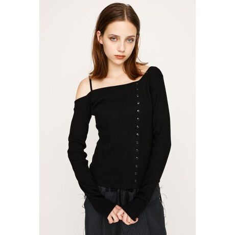 【ASYMMETRY BUTTON TOPS】■POINT:アシンメトリーネックとフロントのボタンがシンプルながら個性を演出するデザイントップス。程よい開きのスクエアネックとシェイプされたウエストが上半身を華奢に見せてくれます。■DETAIL:フロントのボタンはウエストあたりまで開閉可能なので、ボタンの開け具合で表情の変わるアイテム。片方に肩紐が付いたスクエアネックなので、肩が落ちてくることなくストレスフリーで着用いただけるのが魅力。■STYLING:スラックスと合わせてきれいめなコーディネートはもちろん、デニムでカジュアルダウンもおすすめ。アウターのインナーに仕込んでも程良い肌見せがスタイリングに女性らしさをプラスします。■FABRIC/MATERIAL:程よいキックバックのある着心地の良いコットンリブ素材を使用。■透け感:なし■光沢感:なし■伸縮性:あり■裏 地:なし本品は素材の特性上色落ちします。洗濯、クリーニング、着用(使用)時に他の衣類や雑貨、家具類に色移りする事があります。特に汗や雨等で湿った状態では、色落ちが顕著になります。白、淡色との組み合わせは避け、お取り扱いには十分ご注意下さい。[注意事項]※画像の商品はサンプルです。実際の商品と仕様、加工が若干異なる場合があります。※画像の商品は光の照射や角度、お使いのモニター環境により、実物と色味が異なる場合がございます。※着用、お取り扱いの際は、アテンションタグをご確認ください。※一部予約商品につきましては生産上の都合によりお届け予定日や店頭発売と前後する場合もございます。※追加生産商品は、一部の店舗、通販で販売中の場合がございます。予めご了承下さい。