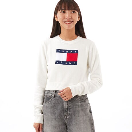 光を受けてキラキラと煌めくスパークルニットのクルーネックセーター。フロントにはTOMMY JEANSのフラッグロゴが編み込まれています。クロップド丈のコンパクトなシルエットで腰位置を高く見せてスタイルアップを実現。ボリュームボトムスとも相性がよく、旬度の高いコーディネートが楽しめます。