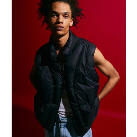 全体的に丸みを帯びたシルエットが特徴的な中綿ダウンベストです。