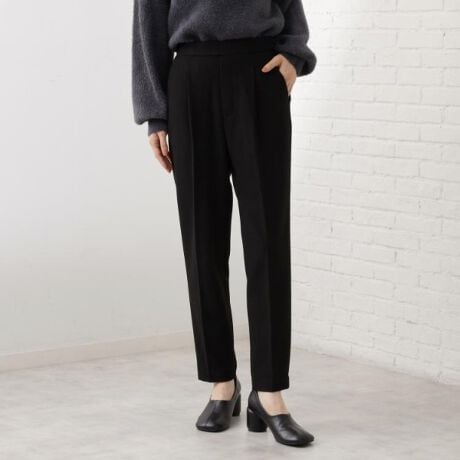 すっきりめのテーパードシルエットがきちんとした印象を保ちます。