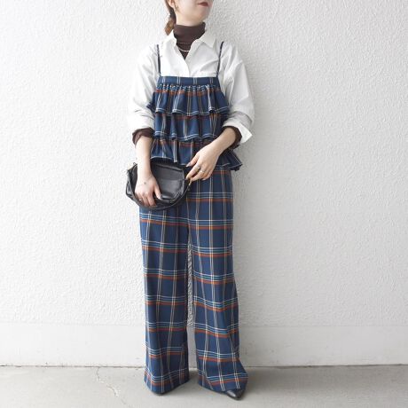 フリルにボリュームがあるため、インナーはコンパクトにまとめるとバランス良く着こなせます。