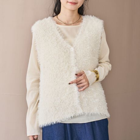 細かな毛足とチュールを合わせた編地で、女性らしい柔らかな雰囲気を演出。