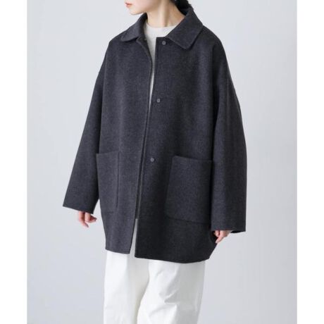 カジュアルからきれいめまで幅広い着こなしにフィットするショートコート。柔らかすぎず適度にハリ感のあるウール生地を使用しています。高品質な生地のため非常に肌触りがよく軽くてあたたかいのが特徴。カットソーからニットまで着用できるサイズ感なのでインナーで温度調節が可能。また裏地が無い一重仕立てを採用し秋冬のシーズンを通して重宝します。ヒップまわりを上手にカバーするショート丈が大人に嬉しいデザイン。スカートにもパンツにもバランス良く合わせていただけます。前立てに付いたスナップボタンは表から見えずミニマムな雰囲気。同素材で他のアイテムもご用意しているのでぜひご覧ください。