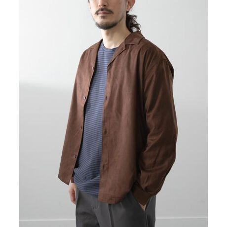 最近注目度が高まっているレザーシャツは、フェイクレザーならではの軽やかさで、羽織るだけでも着心地が快適です。キレイめモードな雰囲気を楽しみたい方にはおすすめの一枚。首元がすっきり開いたオープンカラーで、コーディネートに自然な抜け感と秋らしい温かみをプラスしてくれる一枚です。