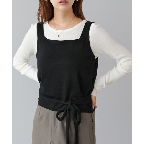 カシュクールベストと薄手ニットを組み合わせた、SETアイテム。アイボリーのインナーに落ち着いたグレー・ブラウン・ブラックのベストを重ねることで、知的で洗練された雰囲気に。セットで着るだけでコーディネートが完成し、それぞれ単品でも活躍する着回し力の高い一着です。