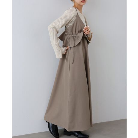 クロスデザインの上身頃と、ウエストのフリルが印象的なペプラムキャミワンピース。まるでビスチェのような立体的なシルエットで、女性らしい華やかさを引き立てます。モカ・ベージュ・ブラックの落ち着いたカラーバリエーションで、大人フェミニンな雰囲気にぴったり。リボンで身幅を調整できるので、体型やシーンに合わせてきれいなラインを楽しめます。