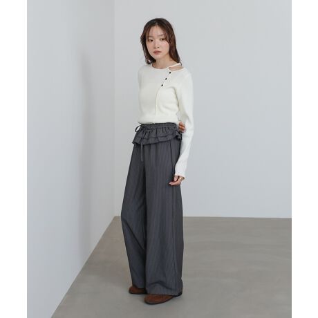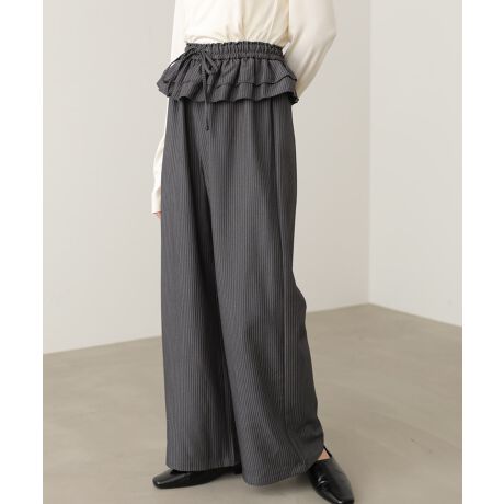 ウエストにあしらわれたフリルがポイントのストライプパンツ。クラシカルなストライプ柄に、さりげないフェミニンディテールを加えることで大人かわいい印象に仕上げています。ブラックとブルーの2色展開で、きれいめからカジュアルまで幅広いスタイリングに対応。ウエストまわりに華やぎをプラスしてくれる、お出かけにぴったりな一本です。