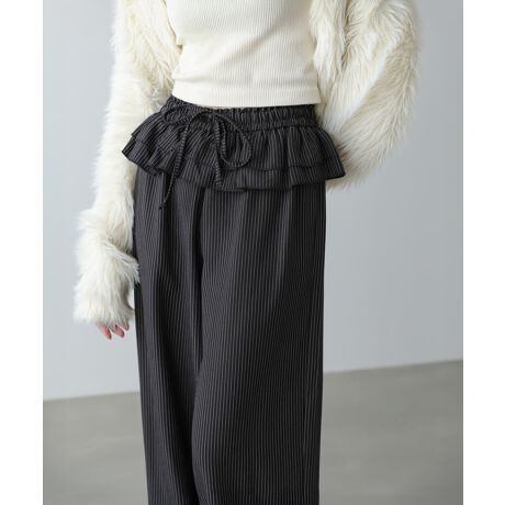 ウエストにあしらわれたフリルがポイントのストライプパンツ。クラシカルなストライプ柄に、さりげないフェミニンディテールを加えることで大人かわいい印象に仕上げています。ブラックとブルーの2色展開で、きれいめからカジュアルまで幅広いスタイリングに対応。ウエストまわりに華やぎをプラスしてくれる、お出かけにぴったりな一本です。