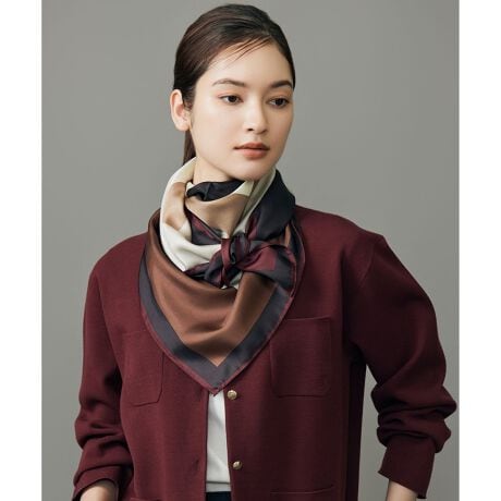 [型番:SF2VGW0401]■デザインスクエアーを重ねたレトロなデザインが特徴のシルク素材スカーフです。スタイリングのポイントになるアイテムです。※画像はサンプルを使用している為、実際にお届けする商品と仕様、加工、サイズが若干異なる場合がございます。予めご了承ください。※撮影環境の都合上、実際の商品と色味が異なって見える場合がございます。