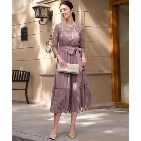 トップス部分がレースの品があるパーティードレスです。裾にはプリーツがあしらわれ、華やぎをプラスします。ウエストはゴムでゆったりながらも取り外し可能なリボンが添えられ、上下での切り替えを強調。