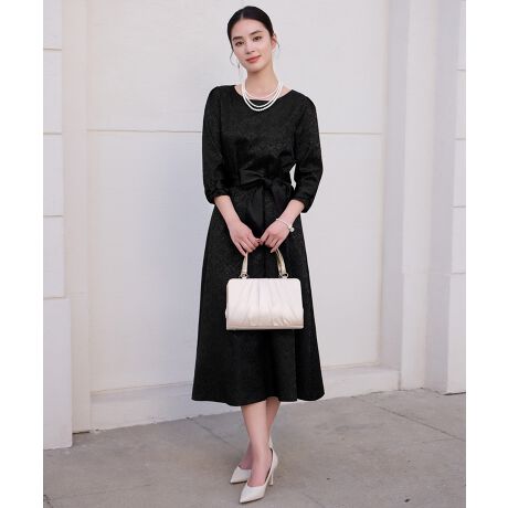 レースの総柄がパーティーシーンで引き立つAラインのワンピースです。袖口にはリボンディティールがあしらわれ、さりげないフェミニンなデザインが華やかさをプラスします。取り外し可能なリボンひもでウエストマークしたり、ゆったり着こなすのもOK。