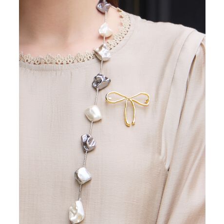 変形ゴールドでリボン結びされたデザインのブローチです。小さめながらもさりげなく存在感をアピールします。シンプルなパーティードレスに物足りなさを感じたときにぴったりです。