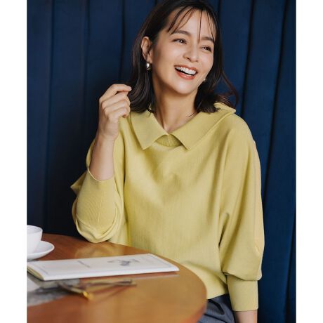 ■デザイン・程よいボリュームのドルマンスリーブに、オフショルダー風の襟元がポイントのプルオーバーニット。・前後着用ができどちらの面にしても完成度の高さが自慢の1枚。・女性らしい柔らかさとしなやかさがありながらも、身体のラインを拾いづらい程よくゆとりのあるシルエットです。・裾周りの収まりがよくボトムスにインしても綺麗にまとまります。・着こなし次第でカジュアルからキレイめまで幅広いスタイリングに馴染む万能ニットです。