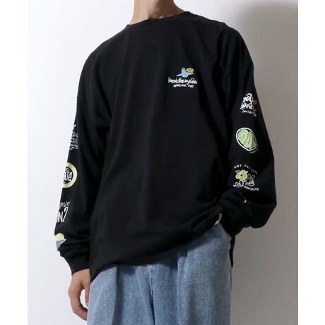 MARK GONZALES ARTWORK COLLECTION/マークゴンザレス 別注 ワンポイント刺繍 バックプリント 袖プリント オーバーサイズ 長袖Tシャツ ロンT レディース メンズ