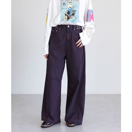ヴィンテージ感ある色合いがトレンドライクなワイドパンツ。レッグラインを拾わないリラクシーな穿き心地がタウンユースに最適な一本です。メタルフックパーツをウエストにプラスし、調節アレンジができるのも嬉しいポイント。着脱しやすいバックウエストゴム仕様や裾周りの切りっぱなしデザインにも注目です。透け感[なし]
