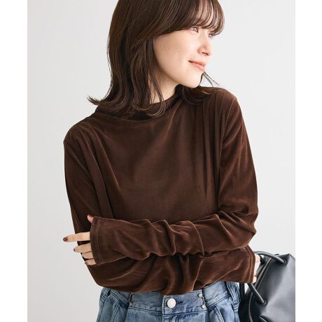 秋冬スタイルに重宝する手触り柔らかなロングスリーブTシャツ。ほんのり透け感のあるベロア調生地でソフトな着心地なのも嬉しいポイントです。品良く演出してくれるボトルネックとショルダータックを施したすっきりとしたシルエットも魅力。1枚ではもちろん、レディなジャンパースカートのインナーとしてもおすすめです。透け感[ややあり]