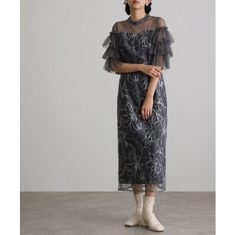 繊細なチュール素材に立体感のあるフラワー刺繍を施した、Iラインドレス。