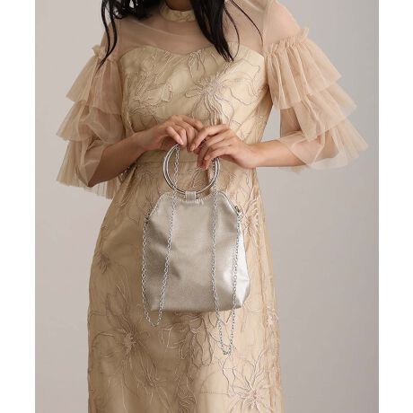 華やかなメタリックのダブルリングが手元を彩る、アクセサリー感覚のパーティーバッグ。