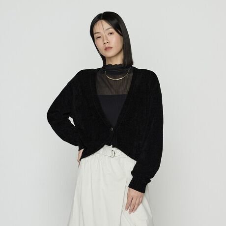 ベルベットのような美しい光沢と思わず触れたくなる、ふんわりもちっとした手触りが魅力のマシュマロニットショートカーディガンです。