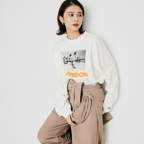 モノトーンフォトと発色の良いメッセージを組み合わせたデザインが遊び心満載なロングスリーブTシャツ。
