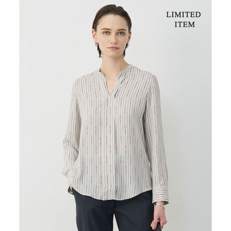 ■デザイン品の良さが際立つV開きの襟元はクリーンな印象の中にも抜け感をプラスしてくれます。オフィスやセレモニーでもシーズンレスに女性らしい印象で重宝する一枚着ブラウスです。一枚着はもちろん、ジャケットのインナーとしてもおすすめです。オフの日はカジュアルなボトム合わせも可能で幅広く活躍します。※スモークグリーン(063)ネイビー(075)ブラックベース×ストライプチェーン柄 (205)トープベース×ストライプチェーン柄(242)は新色です。