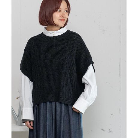 ナチュラルな風合いが魅力のワッフル編みニットベスト。スラブヤーンの表情豊かな糸で、ほんのりラフなムードに仕上げました。ワイドなシルエットとショート丈のバランスが今っぽく、ロンTやシャツとのレイヤードで、こなれ感のあるカジュアルスタイルが完成します。