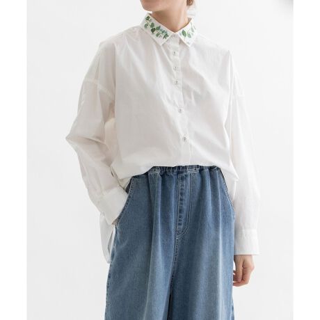 衿に草花刺繍をあしらった、シンプルながらも表情のあるシャツ。緻密で張りのあるタイプライター生地を使用し、きれいめなハンサムに仕立てました。ナチュラルでやわらかな印象をプラスする共布のくるみボタンは、上部だけ間隔を狭くしたデザインで開け具合の調整も可能。後ろが長めの前後差デザインでボタンを開けたときにちらりと見える、下前立ての配色ステッチがさりげないアクセントを効かせています。