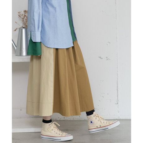 前後で異なる色を組み合わせたタックスカート。どちらの色も楽しめる2way仕様です。カジュアルな中にも自然なAラインが女性らしい、使い勝手のいいアイテム。ロンTなどのカジュアルなトップスを合わせても様になります。ウエストはゴムのイージー仕様。両サイドにポケット付き。