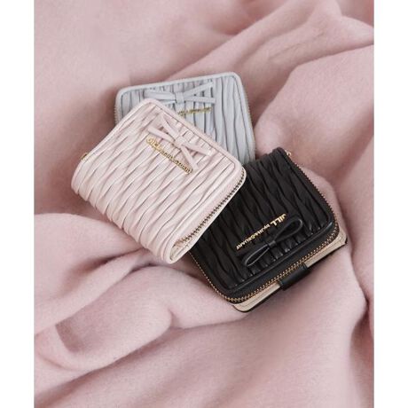 JILL by JILL STUARTのミニリボンパフィーウォレット。エンボス加工のリッチな雰囲気とミニリボンがポイント。バッグの中にコンパクトに収納できる便利な仕様。スナップボタン開閉でカード類・お札入れ、コの字ファスナー部分はコイン入れです。※撮影時照明の関係により、色味が違って見える場合がございます。またパソコン・スマートフォンなどの環境により、若干製品と画像のカラーが異なる場合もございます。予めご了承ください。商品の色味は、商品単品画像をご参照下さい。※商品画像はサンプルのため、色味やサイズ等の仕様に変更がある場合がございますので、予めご了承ください。