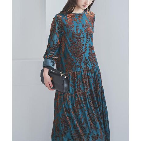 全面にフロッキープリントがあしらわれた、高級感のあるワンピース。部分的にサテンを使用しており、上品な光沢感でメリハリのあるデザインに仕上げました。ストレッチ性があり、リラクシーな着心地もポイント。すとんとしたシルエットにリボンやティアードで甘さをプラスしました。ほんのり透け感があり軽やかさもありつつ、秋らしく一枚で着映えする一着です。
